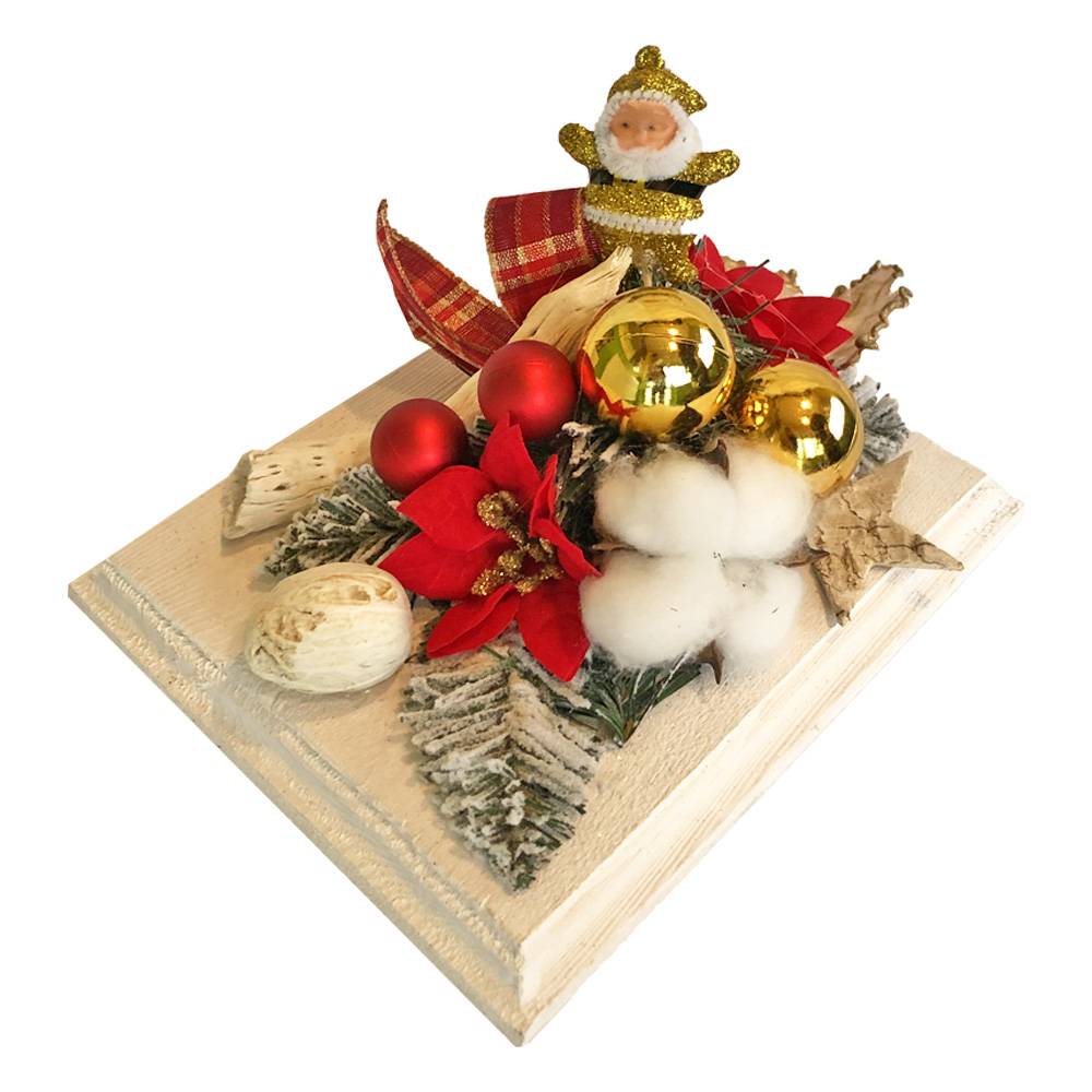 Stroik bożonarodzeniowy skomponowany w kolorze czerwieni, złota i jasnego beżu z figurką Mikołaja w złotym kolorze.  Znakomita ozdoba świątecznego stołu. Stroik do domu, biura.