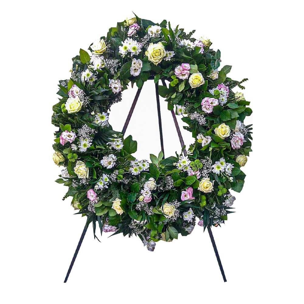 Wieniec okrągły na podstawie z liści jodłowych. Kompozycja z róż ecru, rumianku, oraz polnych kwiatów. Bogate przybranie z zielonych liści i gipsówki. W komplecie szarfa z wybranym napisem pożegnalnym.